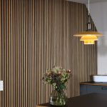 Sonawood Vireon is een hoogwaardig houten akoestisch wandpaneel dat natuurlijke esthetiek combineert met uitstekende geluidsabsorptie. Dankzij de verfijnde fineerafwerking behoudt het paneel de authentieke kleur- en nerfvariaties van echt hout, wat zorgt voor een warme en luxe uitstraling in ieder interieur.